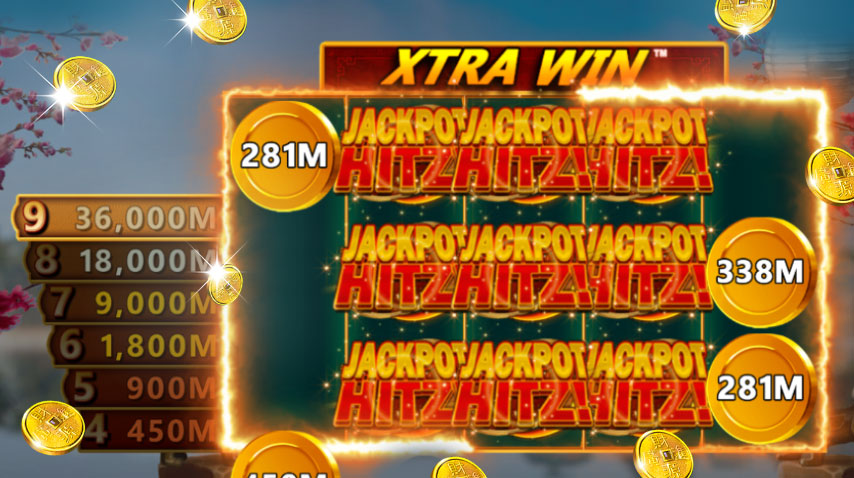 Jackpot Hitz: Landing 4 or more Jackpot Hitz symbols scattered on the middle 3 reels triggers the feature. During the feature, the middle 3 reels are held, and coins from a lantern, land on reels 1 and 5. These coins can award a multiplier or extra prize values. The feature awards prizes in a range of 5x to 400x the total bet, and multiplier multiplies the Jackpot Hitz prizes only.